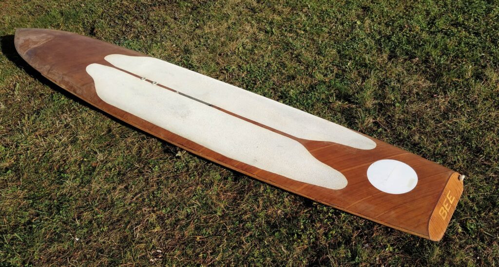 We don´ t have any info about the board history and it´ s construction, but here are the details from very similar board built by Jorgen Sandig in 1983. I´ d guess our Flying Arrow can look similar inside… (pics from Old School Windsurfers group).