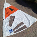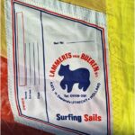 This Windsurfer was built in 1976 and had the wooden boom, mastfoot and daggerboard. A lovely reminder of the history of this board is the sticker from a gas station close to Le Mans (Fr) and an extra sail number, which indicated that this board was allowed to sail on a lake somewhere in Germany.